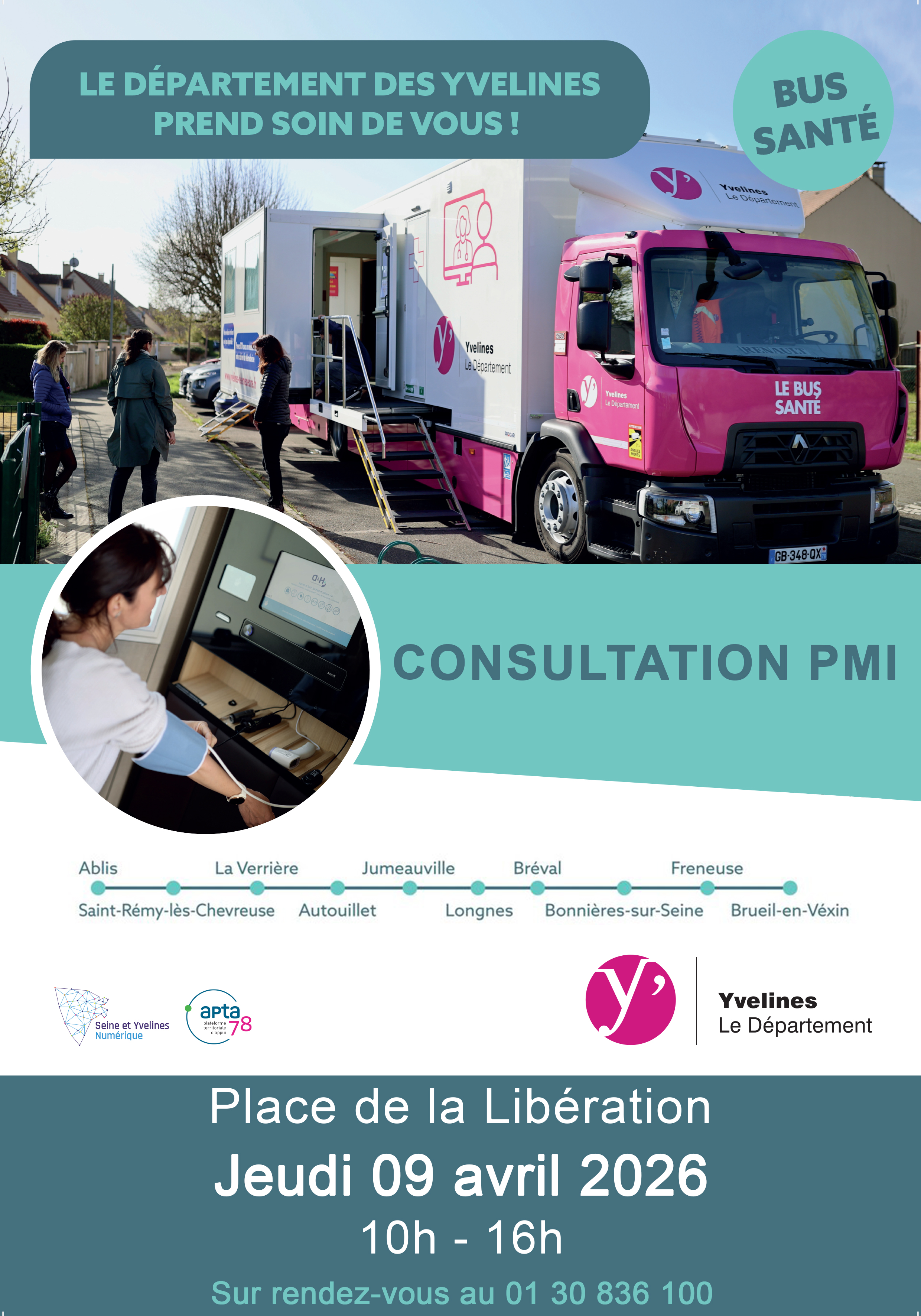 Le bus santé sera présent à Bonnières-sur-Seine, le jeudi 09 avril 2026, de 9h30 à 16h, sur la place de la Libération.
